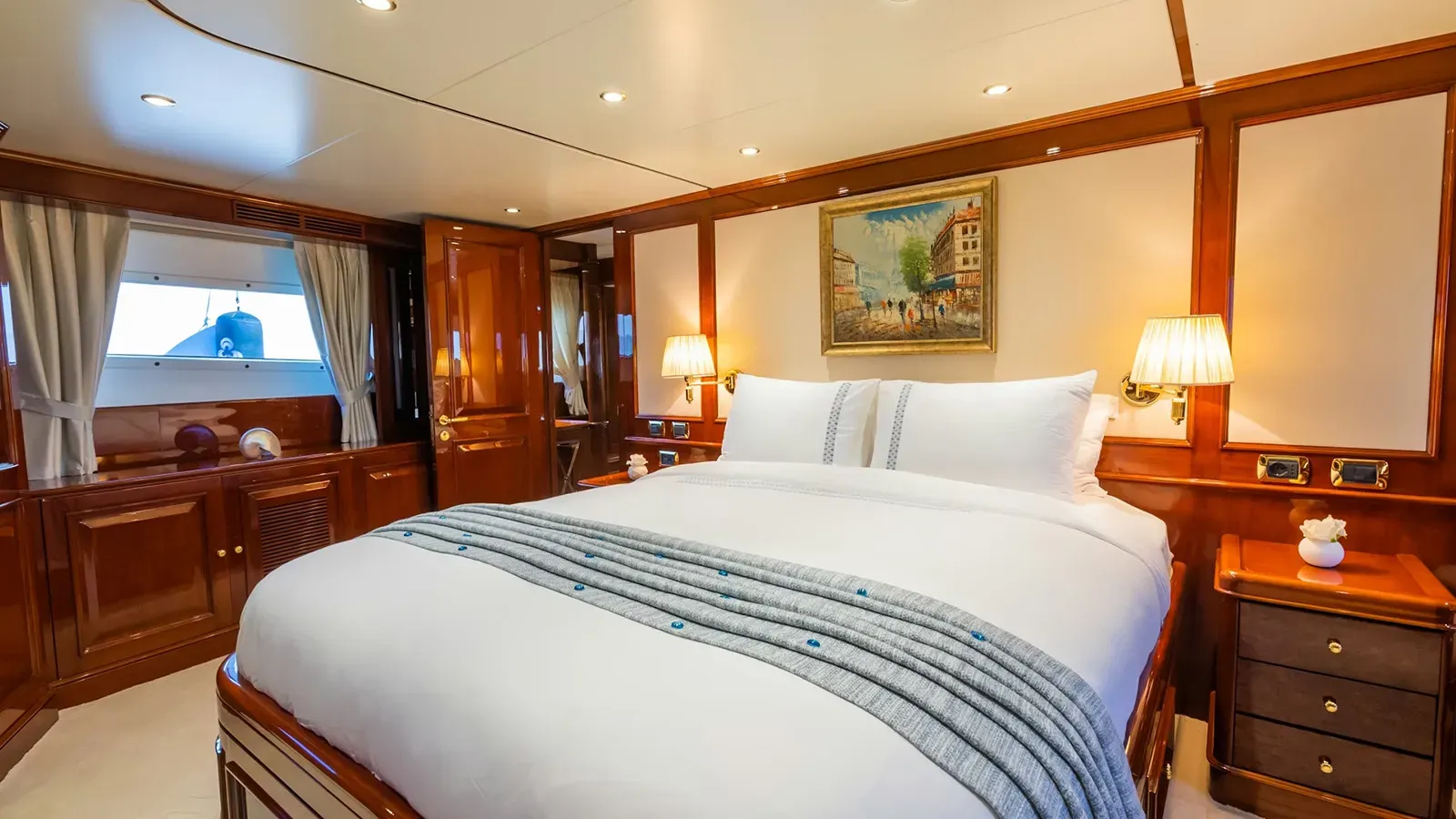 Accommodation is arranged for up to 10 guests across five well-proportioned cabins. The layout includes an upper-deck owner’s suite, a full-beam VIP cabin on the main deck, a second full-beam VIP on the lower deck and two twin cabins. Separate crew quarters provide space for seven, supporting both private use and charter potential.
