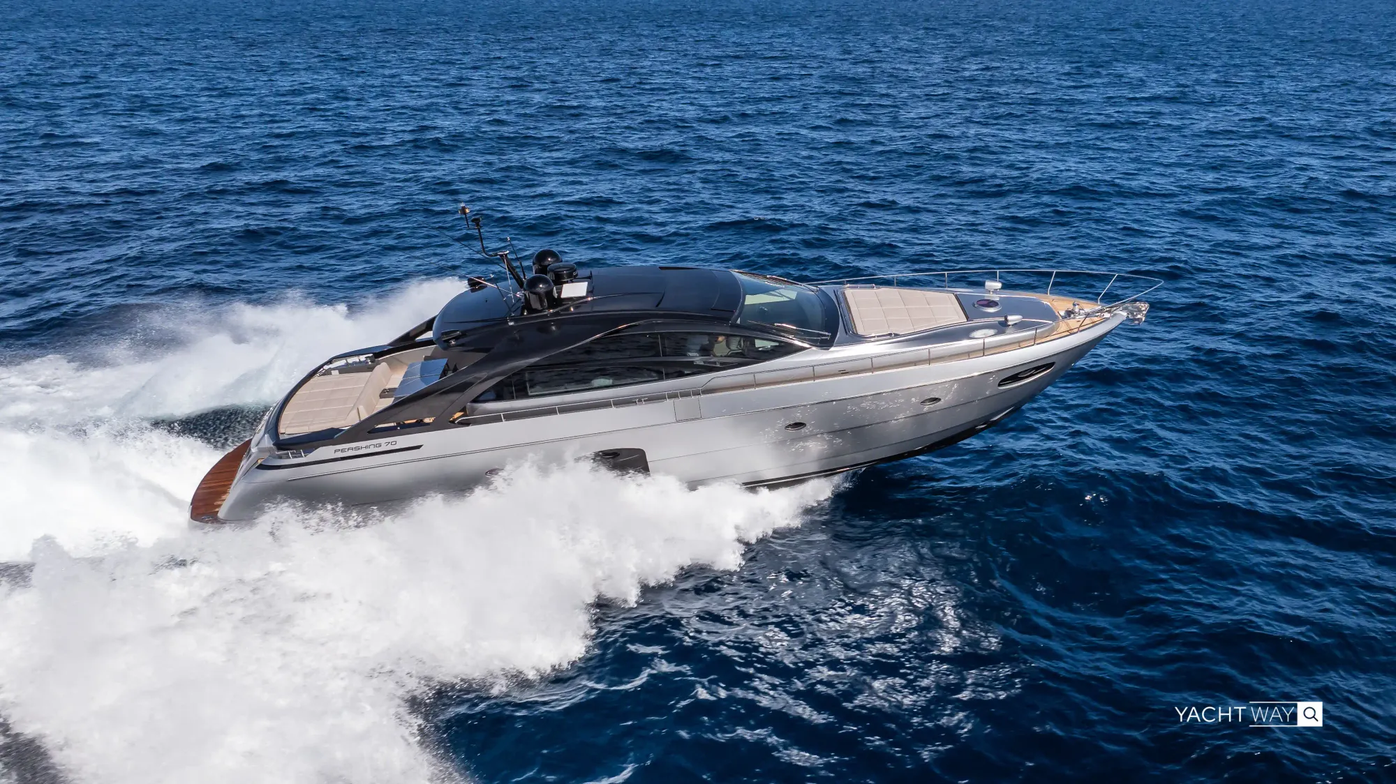 The Pershing 70 is a great example of a semiplaning v-hull built for performance — note the pointed bow and the flat, wider stern.