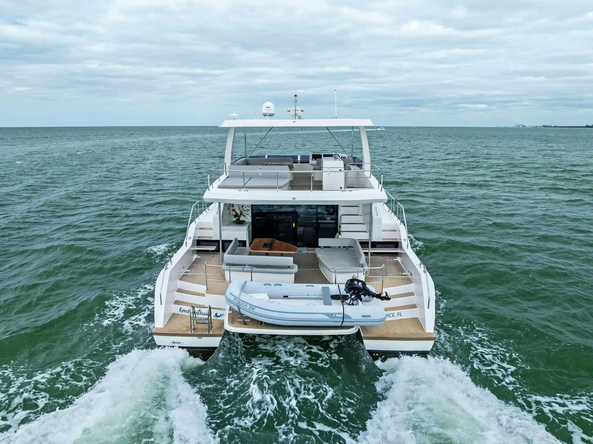 Below, the Leopard 53 shows both the hull shape (note the water in the center) and the amount of space the shape provides — enough to store a tender. On the right, the Dragonfly 40 shows the increased stability of the trimaran in waves, with one outrigger keeping the boat from heeling too far over.