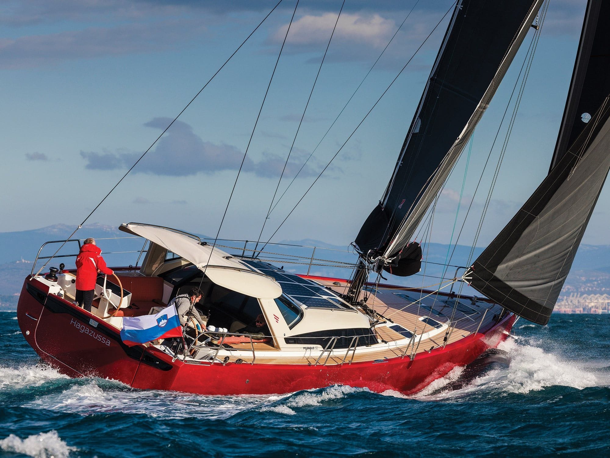 Although this Pegasus 50 has a pointed bow, note the shape of the stern to see the typical sailboat rounded hull.