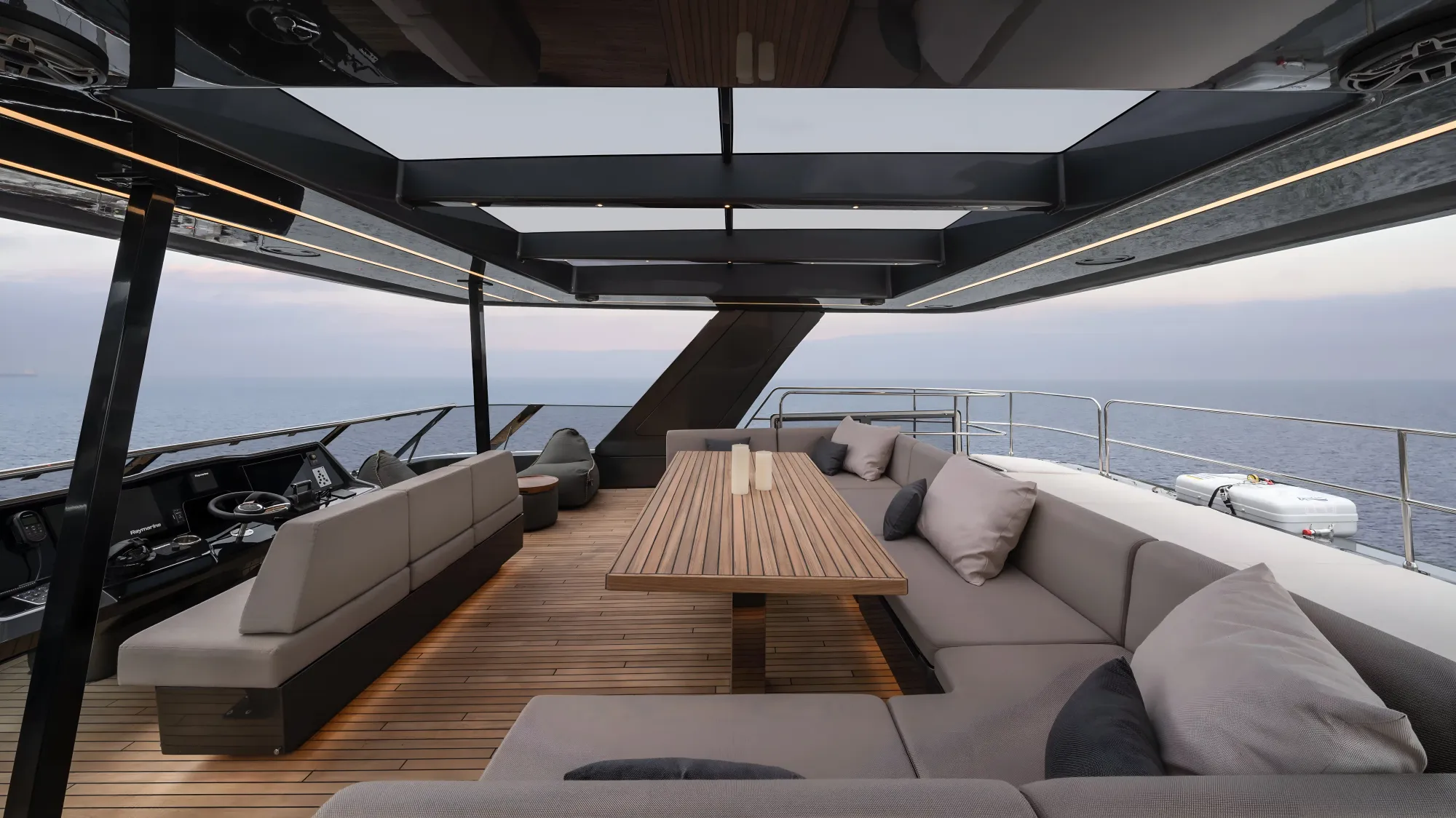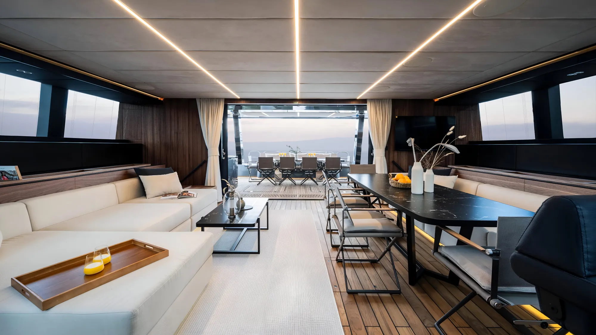 From the moment you step aboard, the sensation is one of openness. The expansive aft cockpit merges seamlessly with the salon, creating a vast indoor-outdoor entertaining space shaded by the flybridge overhang. Oversized modular lounges, a wet bar, and panoramic dining make this area the beating heart of the yacht — ideal for long afternoons at anchor or elegant evenings under stars.
