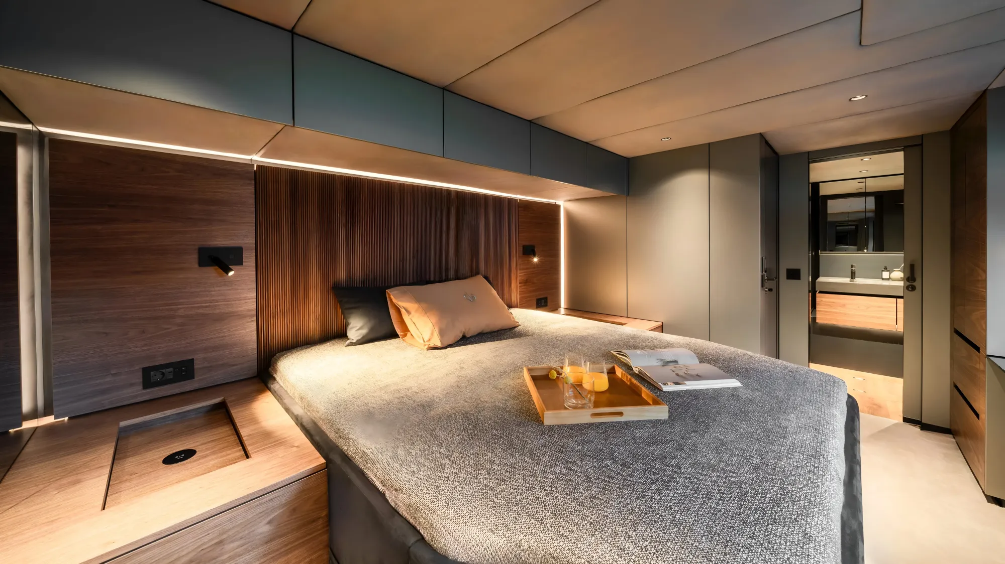 The staterooms aboard the Sunreef 60 are nothing short of generous. In a standard four-cabin layout, each suite features king or queen berths, en suite bathrooms, and ample storage — all wrapped in soft textures, ambient lighting, and thoughtful craftsmanship. The master suite is a particular triumph: full-beam, quiet, and remarkably private, it offers a retreat that rivals boutique hotel suites ashore.