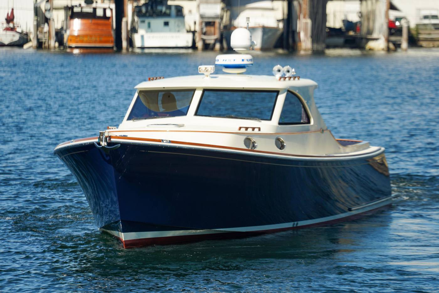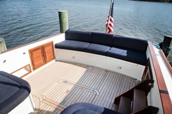 The sheer versatility of Grace is evident in her thoughtfully designed deck and accommodations. The stunning teak cockpit serves as both a social and functional space, boasting a bench-style transom settee, two aft-facing sun pads, and an array of built-in stowage options. For day trips, she comfortably hosts ten guests, while her overnight configuration offers a two-stateroom setup, complete with a V-berth forward and a queen berth amidships.