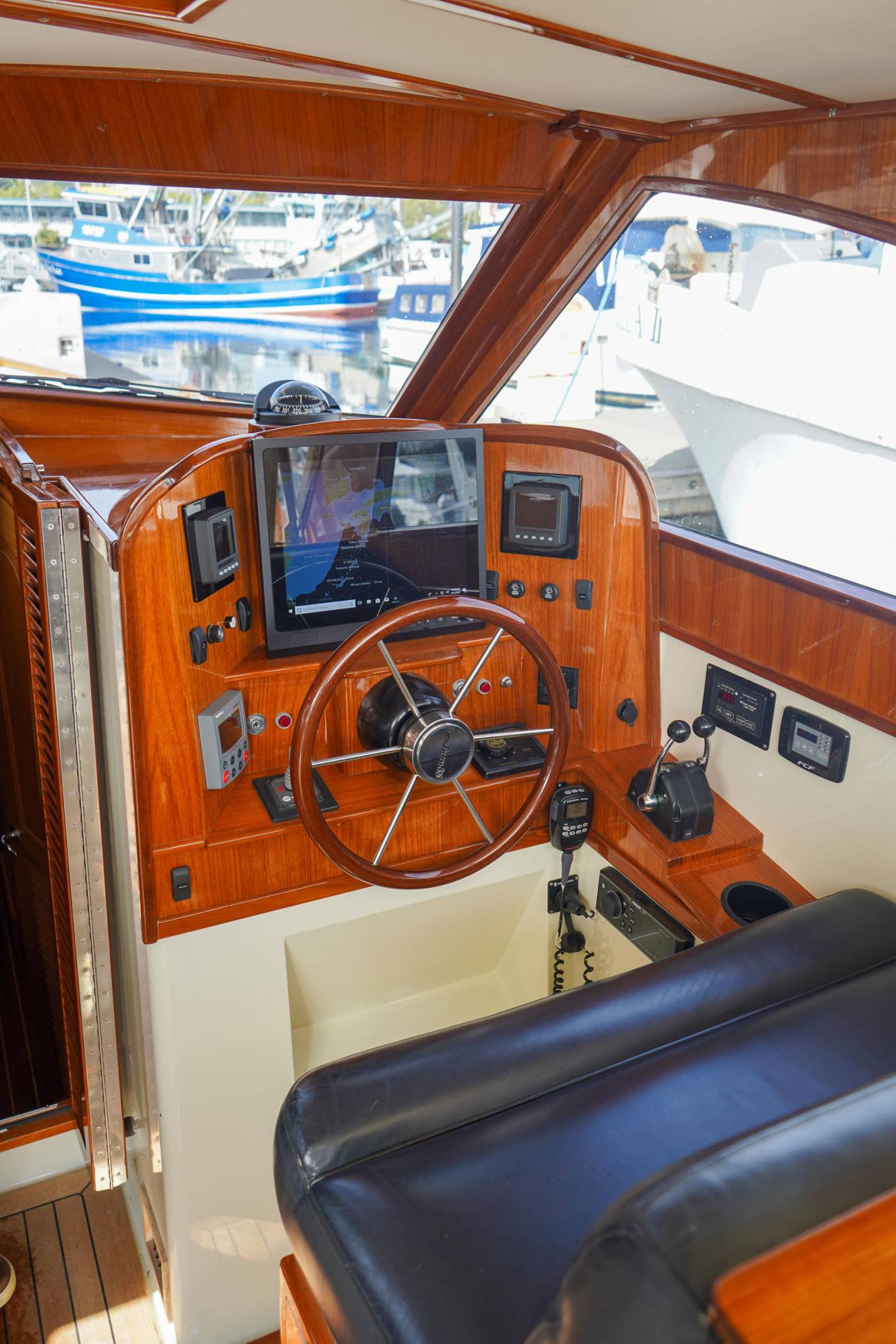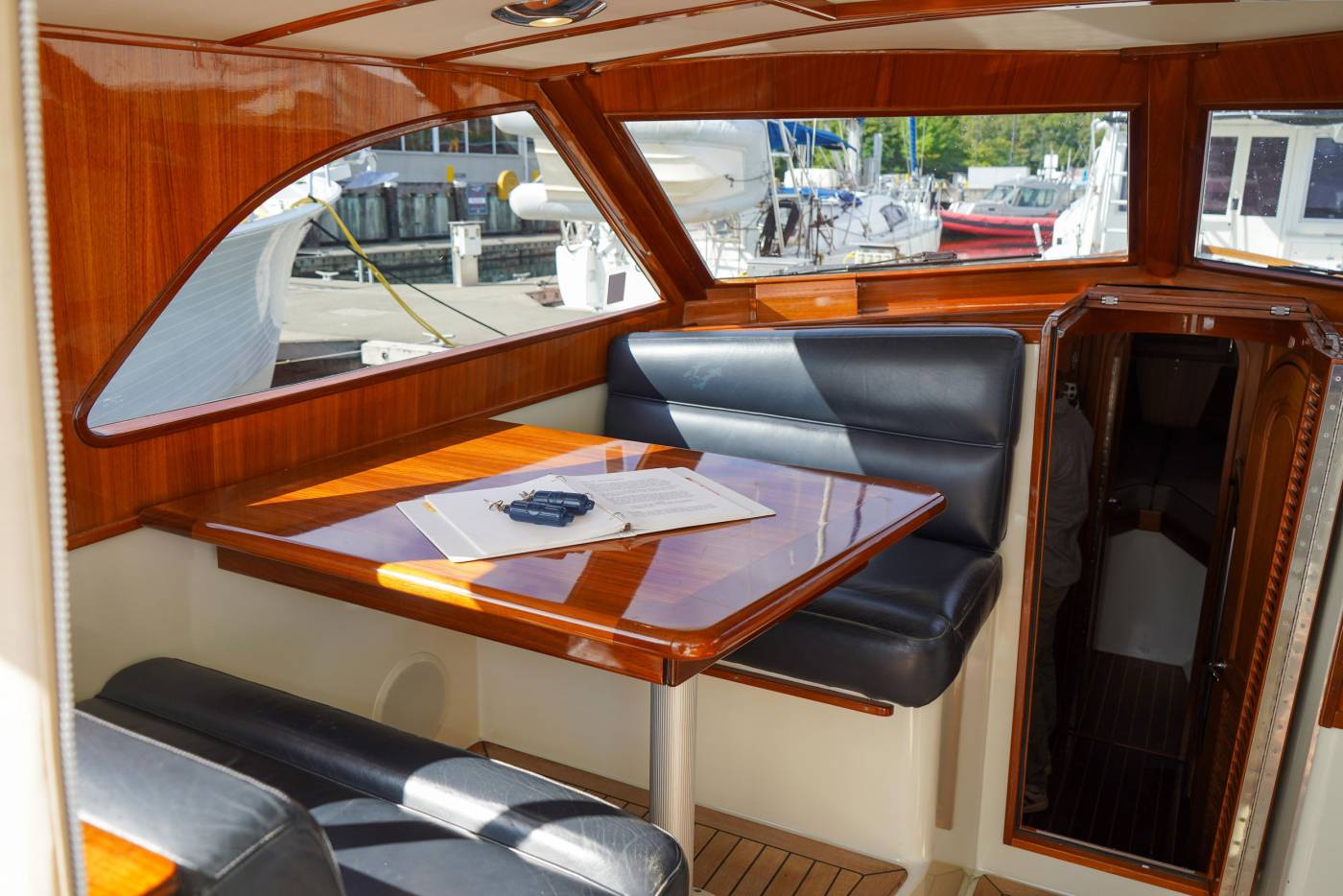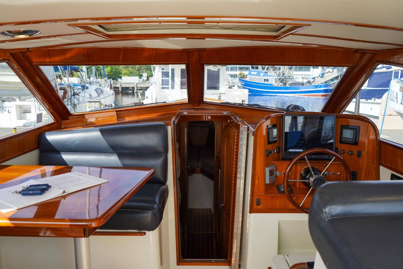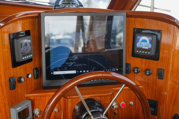 Inside the pilothouse lies a sanctuary of comfort, highlighted by the Webasto Thermal 90 reverse-cycle air and heating system, generating an impressive 31,000 BTUs. Whether entertaining guests or enjoying solitude, the expansive windows and an opening sunroof ensure natural light and fresh air create a harmonious environment. The cockpit door further complements this open-air sensation.