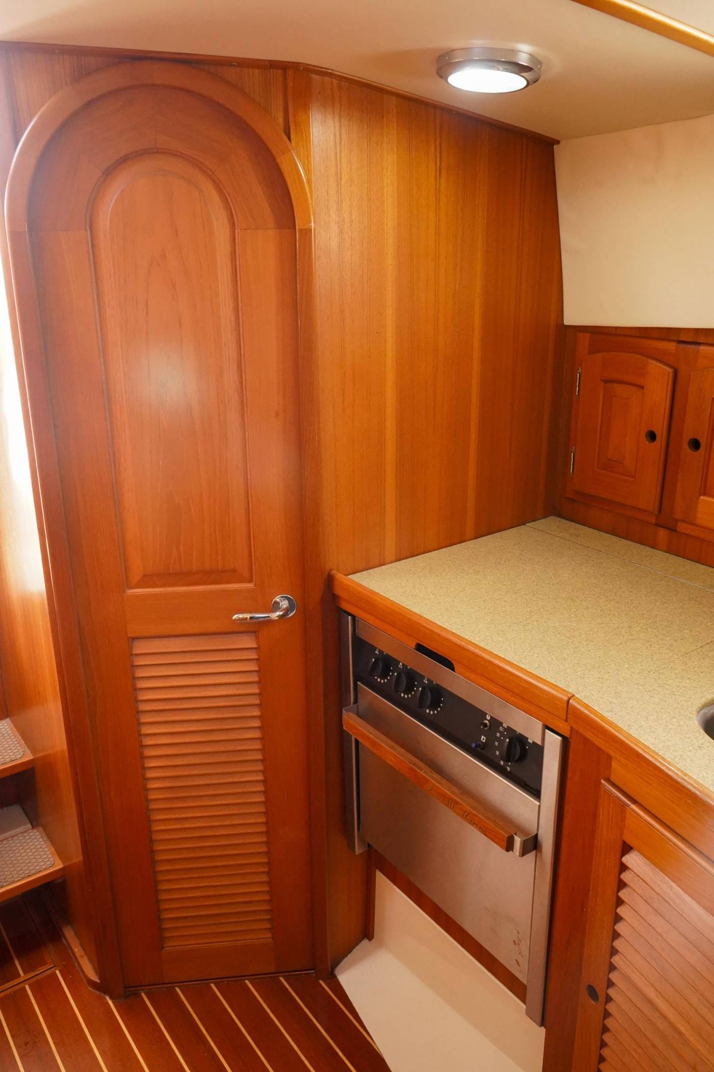 Descending to the galley showcases a well-equipped space, where culinary endeavors are supported by the Force 10 three-burner propane oven/range, a stainless-steel sink, and a refrigerator. The overhead cabinets and drawers provide ample storage, maintaining the galley's pristine presentation.