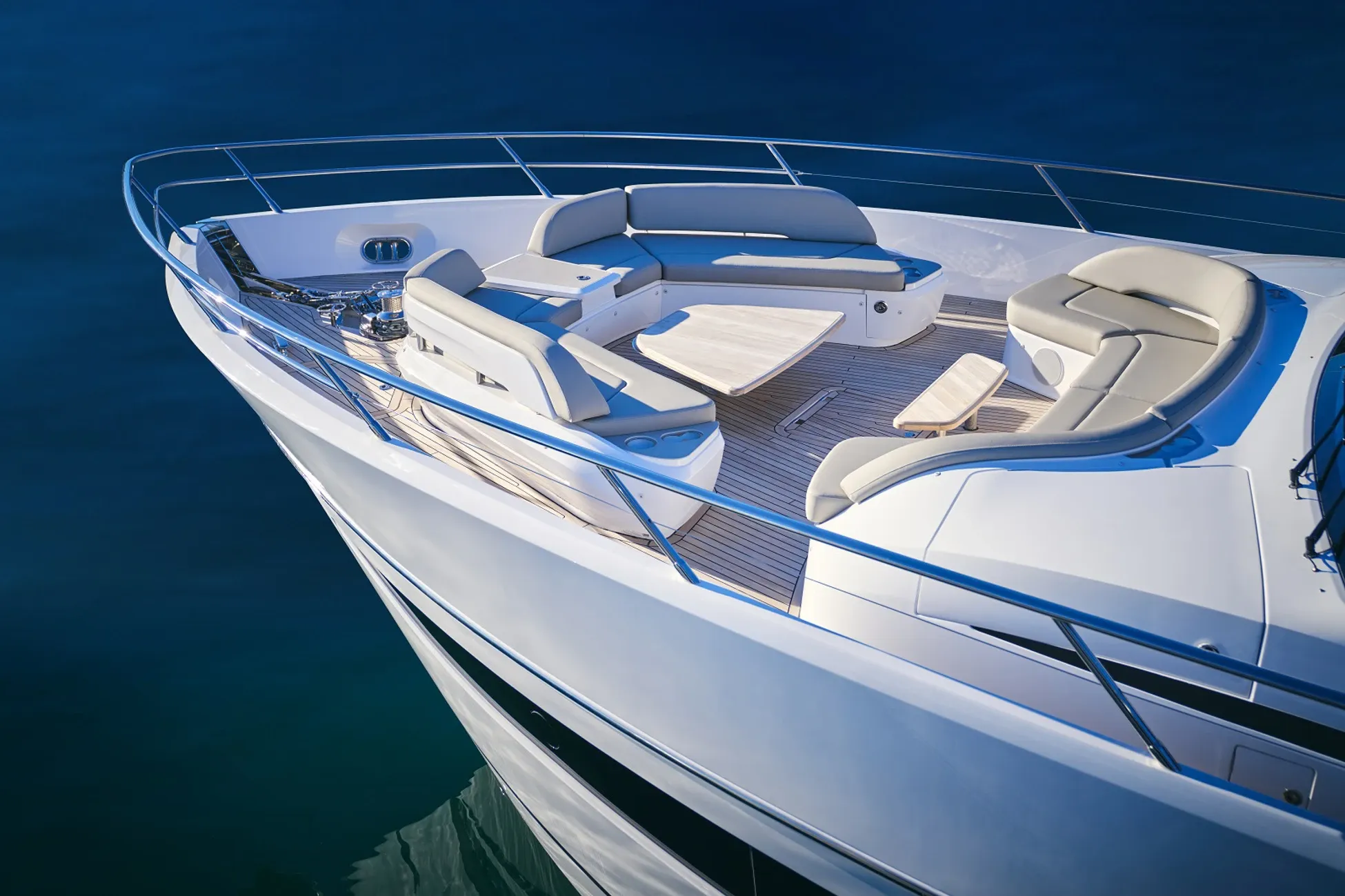 One of the S80's compelling features is its ability to cater to sun-loving enthusiasts. The foredeck is designed with dual C-shaped booths that can morph into sun pads, optimizing space for relaxation. This is complemented by the low-profile flybridge, which expands the outdoor entertaining possibilities significantly without compromising the yacht's aerodynamic efficacy.