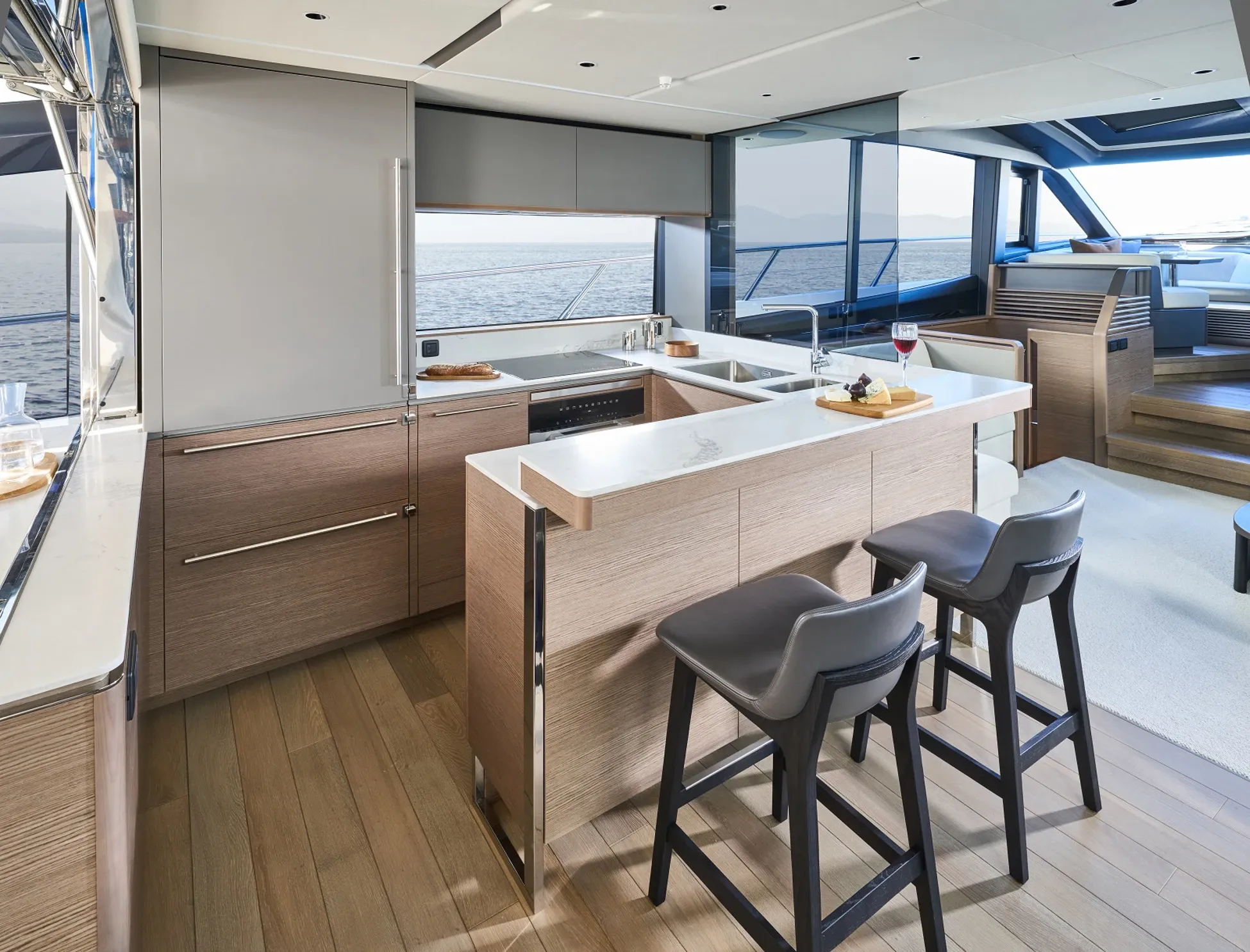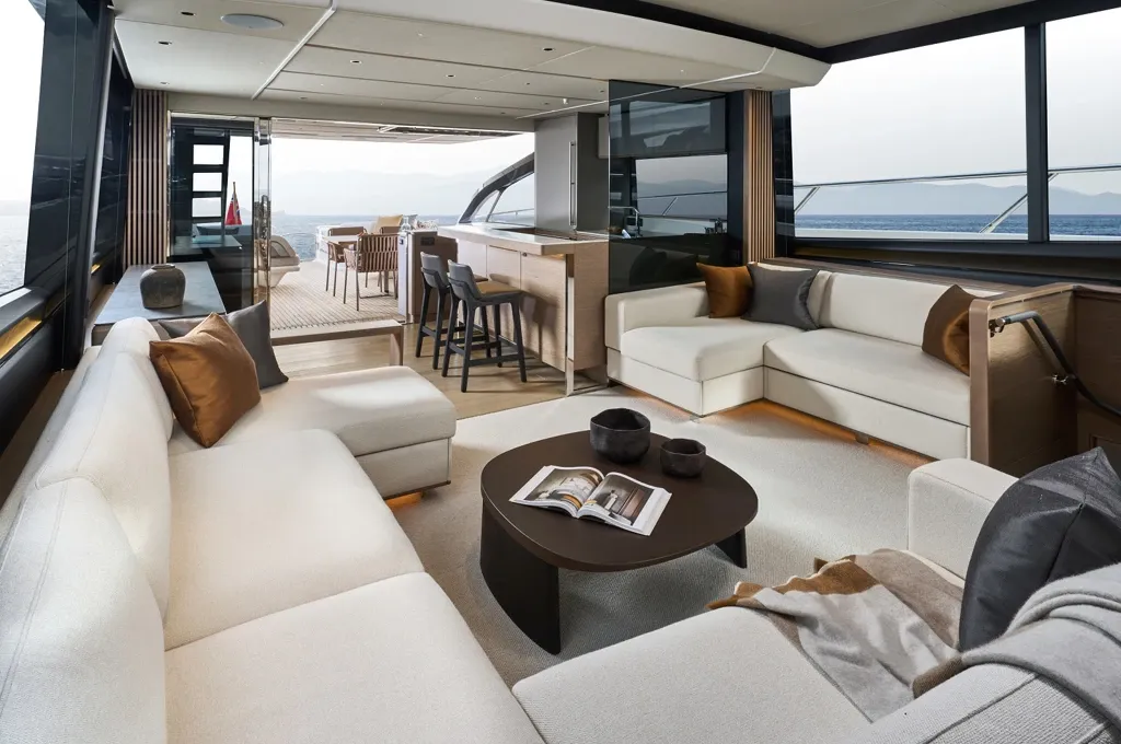 The thoughtful design of this luxury yacht enhances outdoor living, starting from a strategic cockpit that combines intimacy with functionality. Aboard the S80, natural light floods the space through picture windows that align with the expansive layout's ethos of openness and freedom. The galley’s placement allows for seamless transitions between indoor luxury and alfresco entertainment areas.