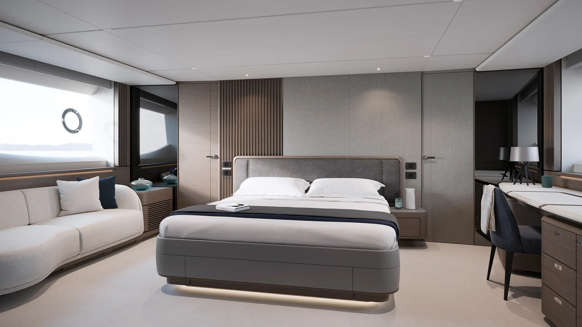 Descending below deck reveals four beautifully appointed en suite staterooms. The full-beam owner’s room offers a peaceful retreat with its super-king berth and panoramic views, while maintaining privacy through sound-buffering layouts.