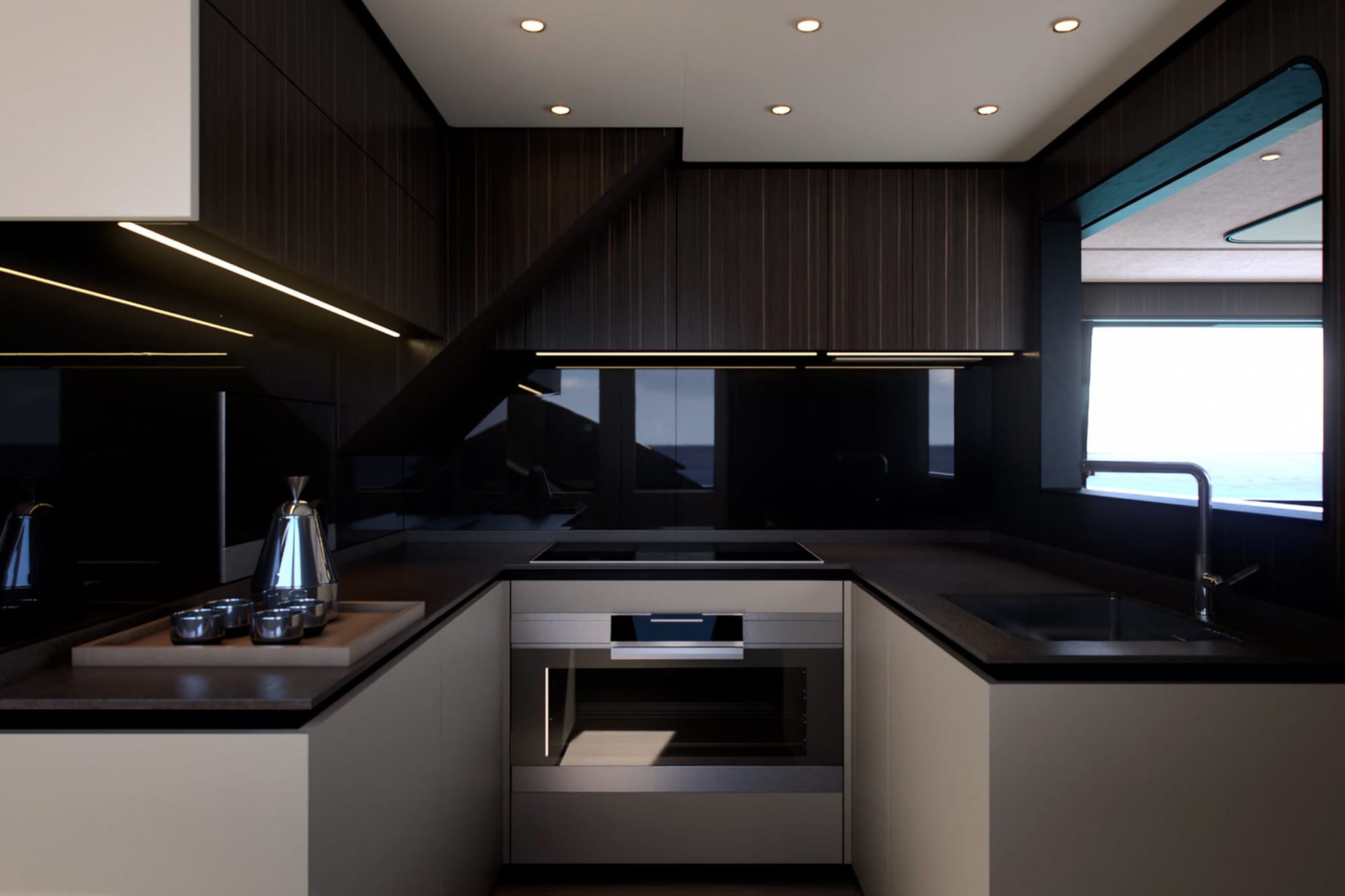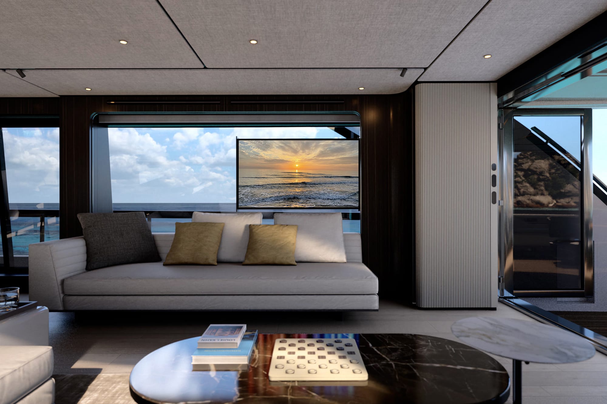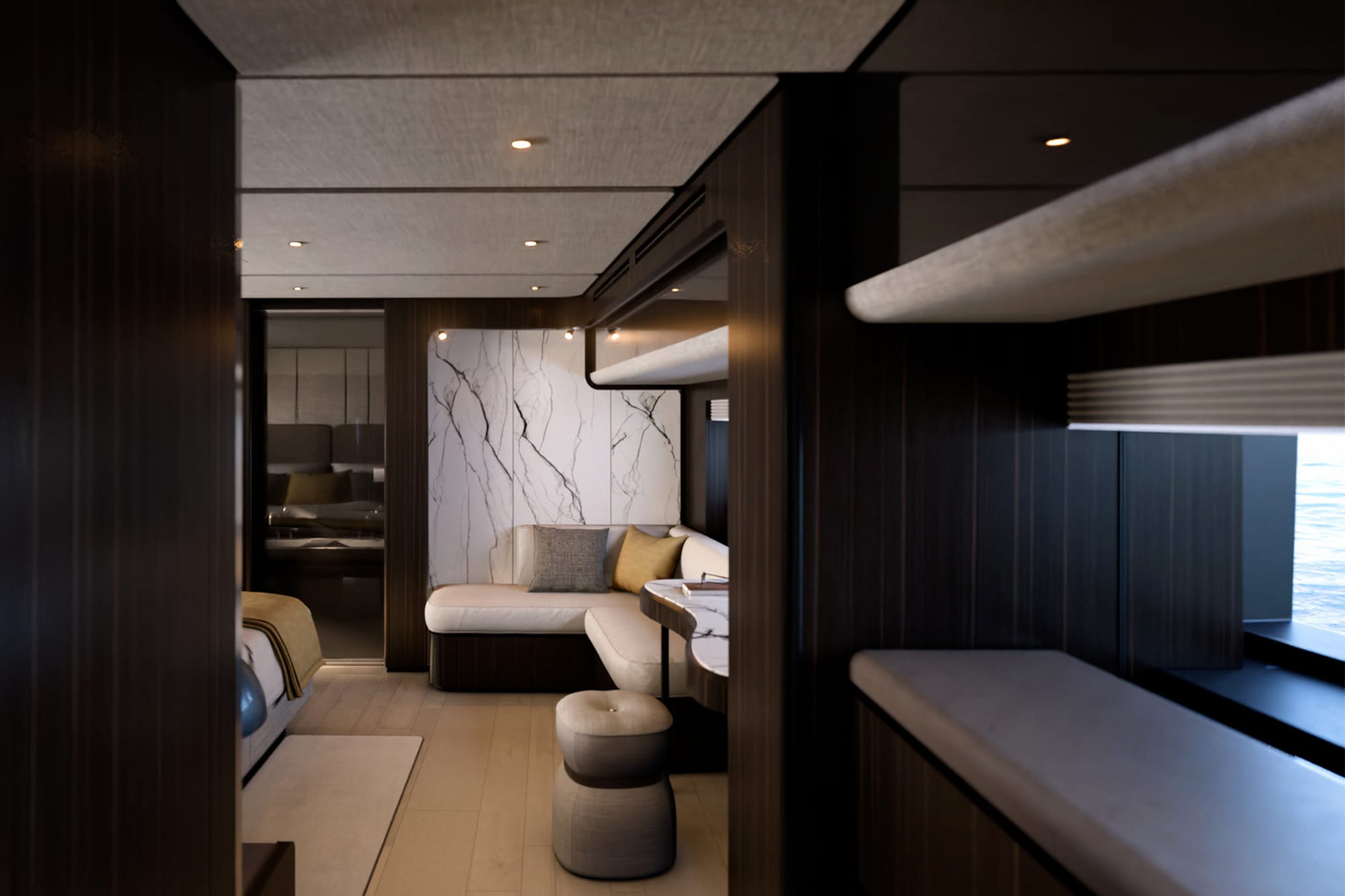 Sophistication continues into the 325-square-foot salon, designed for both comfort and style. An inviting L-shaped sofa and a sleek dining table for eight make this space ideal for both intimate gatherings and larger celebrations. Enhancing its functionality, a sliding TV and stowage unit add to its modern charm. The seamless transition between the cockpit—adorned with freestanding furniture and a glass parapet—and the salon is achieved through sliding glass doors, creating a fluid, open living experience.