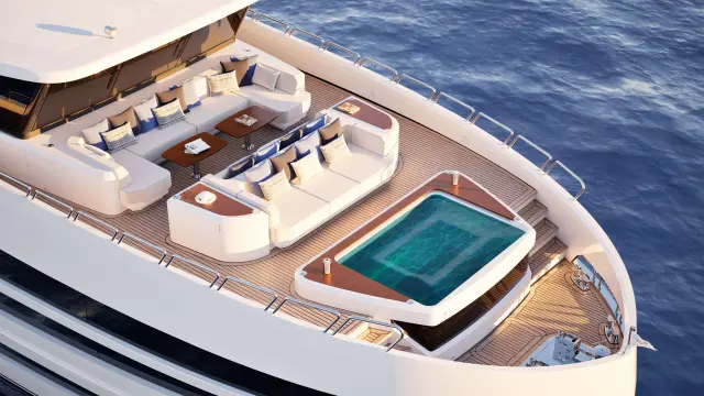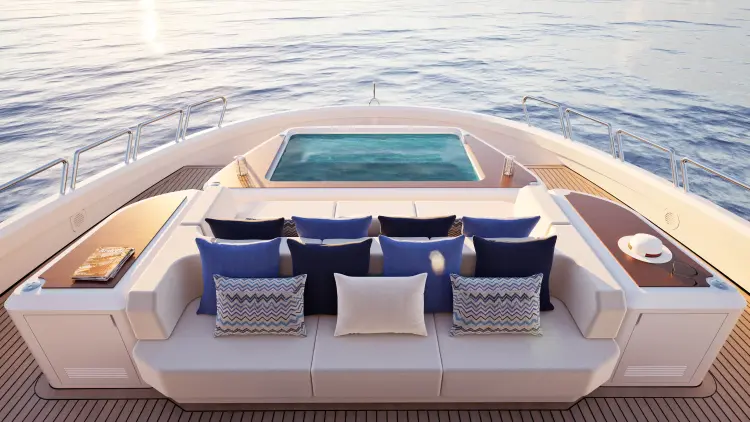 The foredeck dip pool, a six-person hot tub lounge, is the feature most clearly distinguishing the UHV 100 from its predecessor in the series, and speaks to the shifting expectation among owners at this price point: the forward deck is no longer a working area. It is an entertainment zone.