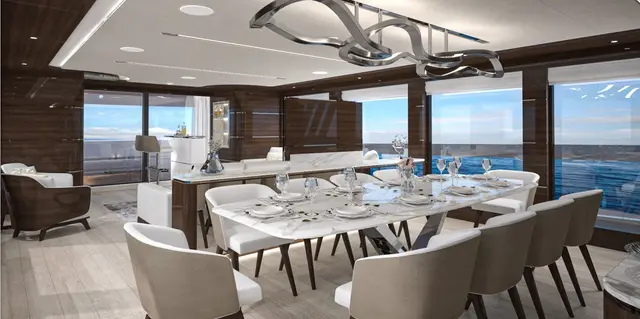 Interior renderings released last year by joint central agents Fraser and Northrop & Johnson showed a scheme of dark woods, neutral furniture, and considered colour accents in soft furnishings and artwork... an approach that reads as restrained without being austere. Floor-to-ceiling windows throughout, floating floors across all three decks for acoustic isolation, and Miele-equipped galley facilities confirm that the attention to specification extends well past the structural.