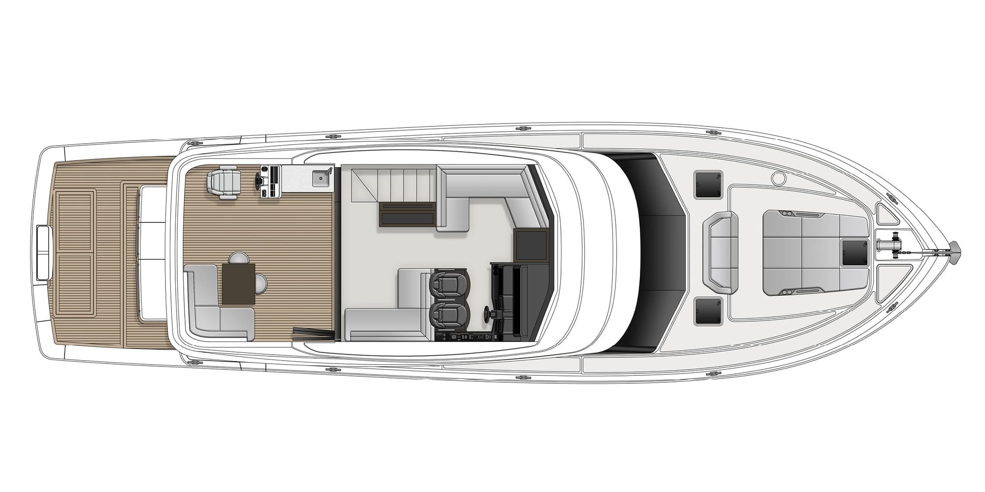 The upper cockpit and adventure deck afford not just optimal views but also practical amenities for entertainment. Quality seating, dining facilities, along with a barbecue grill and refrigeration, provide everything needed for alfresco living.