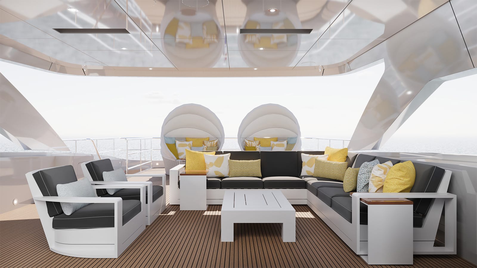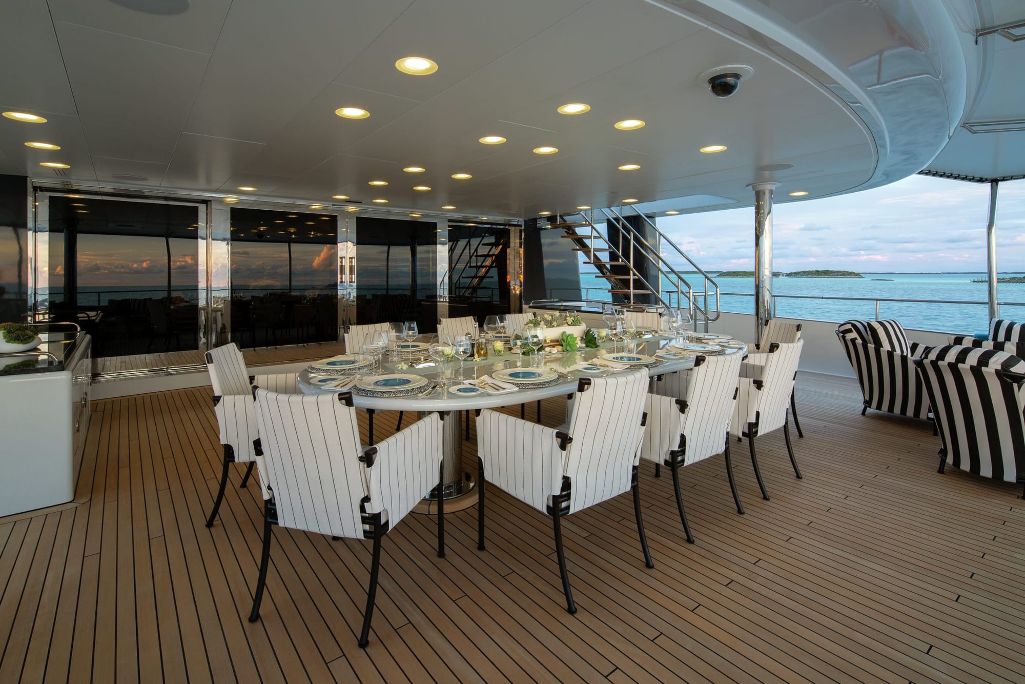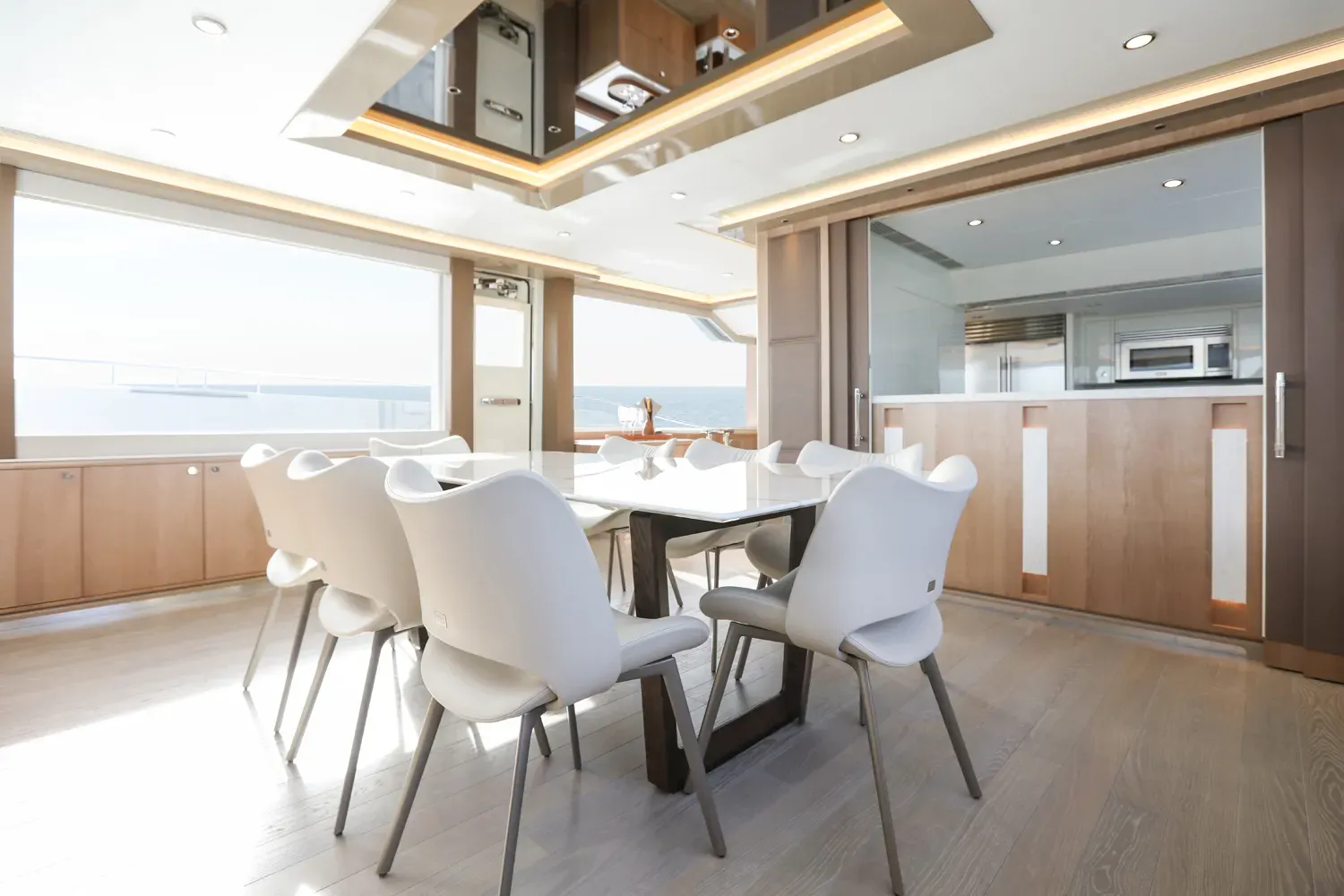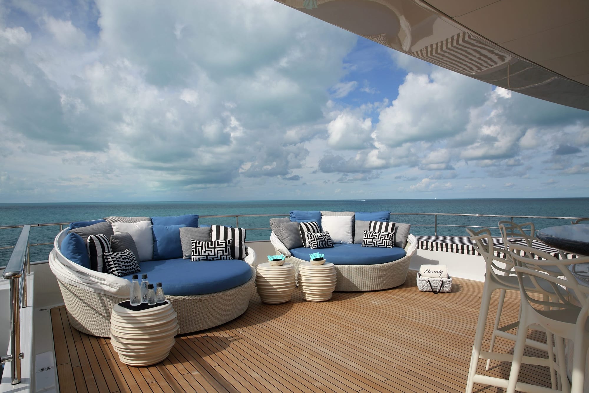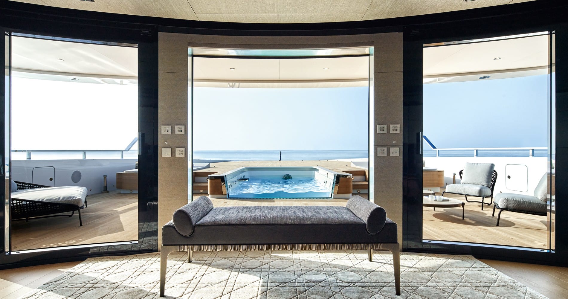 Designed for seamless indoor-outdoor living, Eternity offers a variety of versatile social spaces. The sundeck is a haven for relaxation, featuring sumptuous sunpads, a stylish bar, an elegant lounge area, and a fully enclosed gym with its own shower. Forward on the foredeck, a six-meter Jacuzzi pool serves a dual purpose, functioning as an exercise pool with multiple current resistance settings—ideal for both leisurely dips and invigorating workouts.