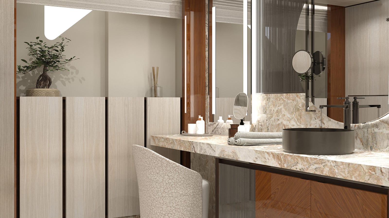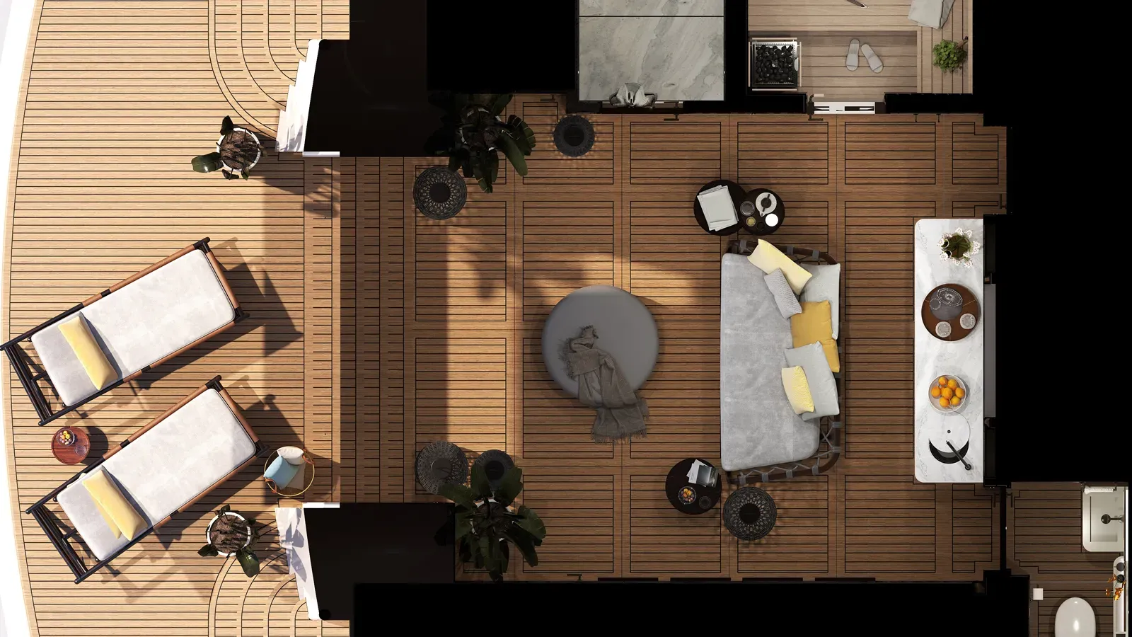 Beyond her lavish accommodations, Lemon Tree is designed for wellness and relaxation, boasting a spacious Hammam and a beach club with openings on three sides, creating a seamless connection with the sea. A glass ceiling above filters natural light from the swimming pool above, undisturbed by the strategically positioned amidship garages.