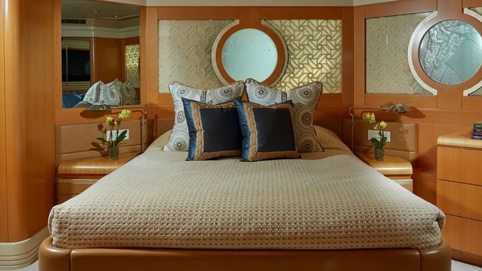 Each stateroom is a testament to luxury — the owner’s suite is a full-beam haven with a king-size berth, dual bathrooms, one including a Roman tub. The VIP stateroom provides similar comfort, adorned with jade marble and a skylit shower. Additional guest staterooms offer serene quarters with ample storage and heated soles.