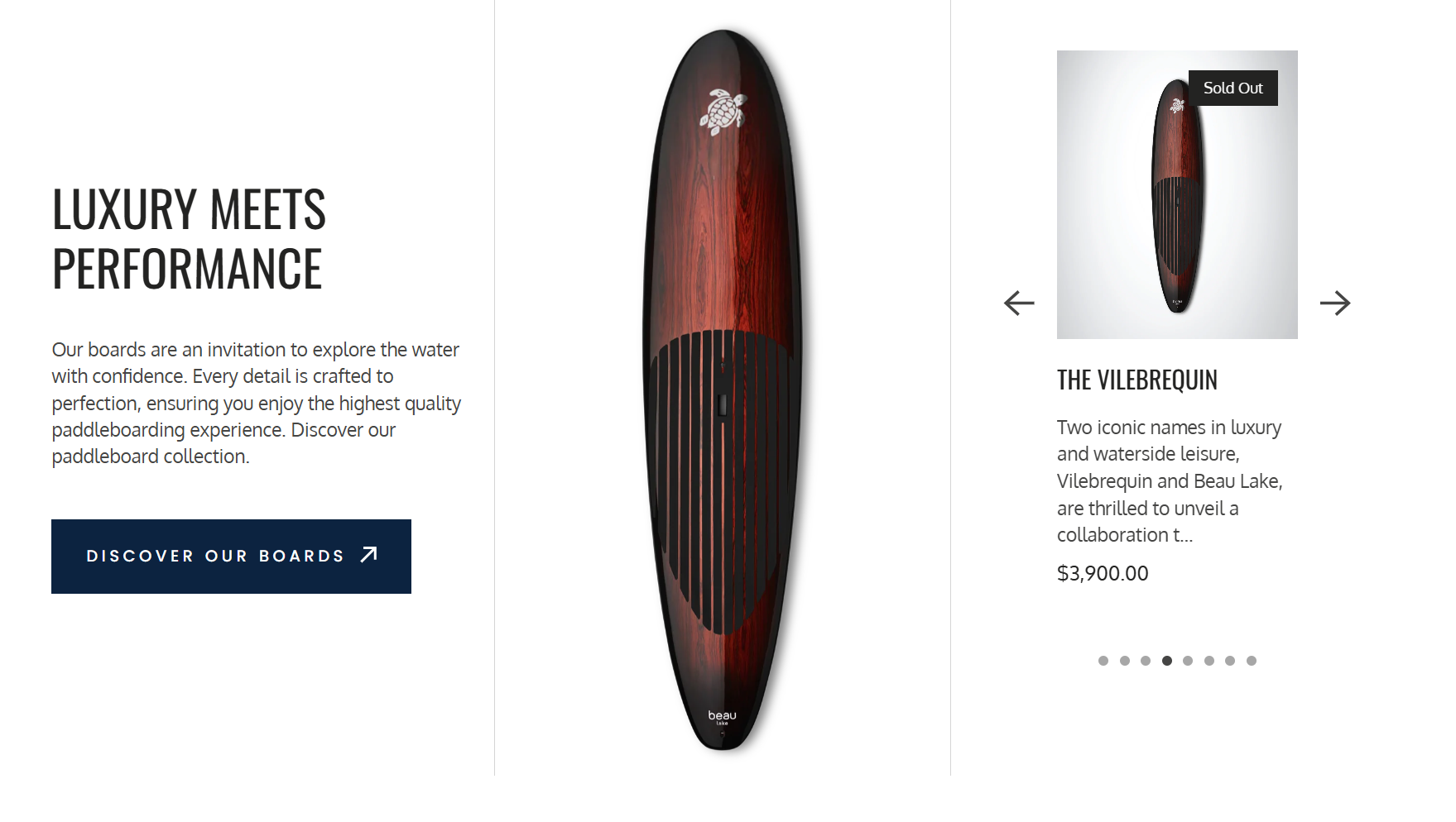 Each paddleboard in the Beau Lake collection is a testament to detail. Mahogany inlays, marine-grade finishes, and sustainably sourced materials blend seamlessly with modern composites, resulting in boards that are as agile on the water as they are striking in the boathouse. From the warm gleam of walnut veneers to the minimalist chrome accents, no element is overlooked.