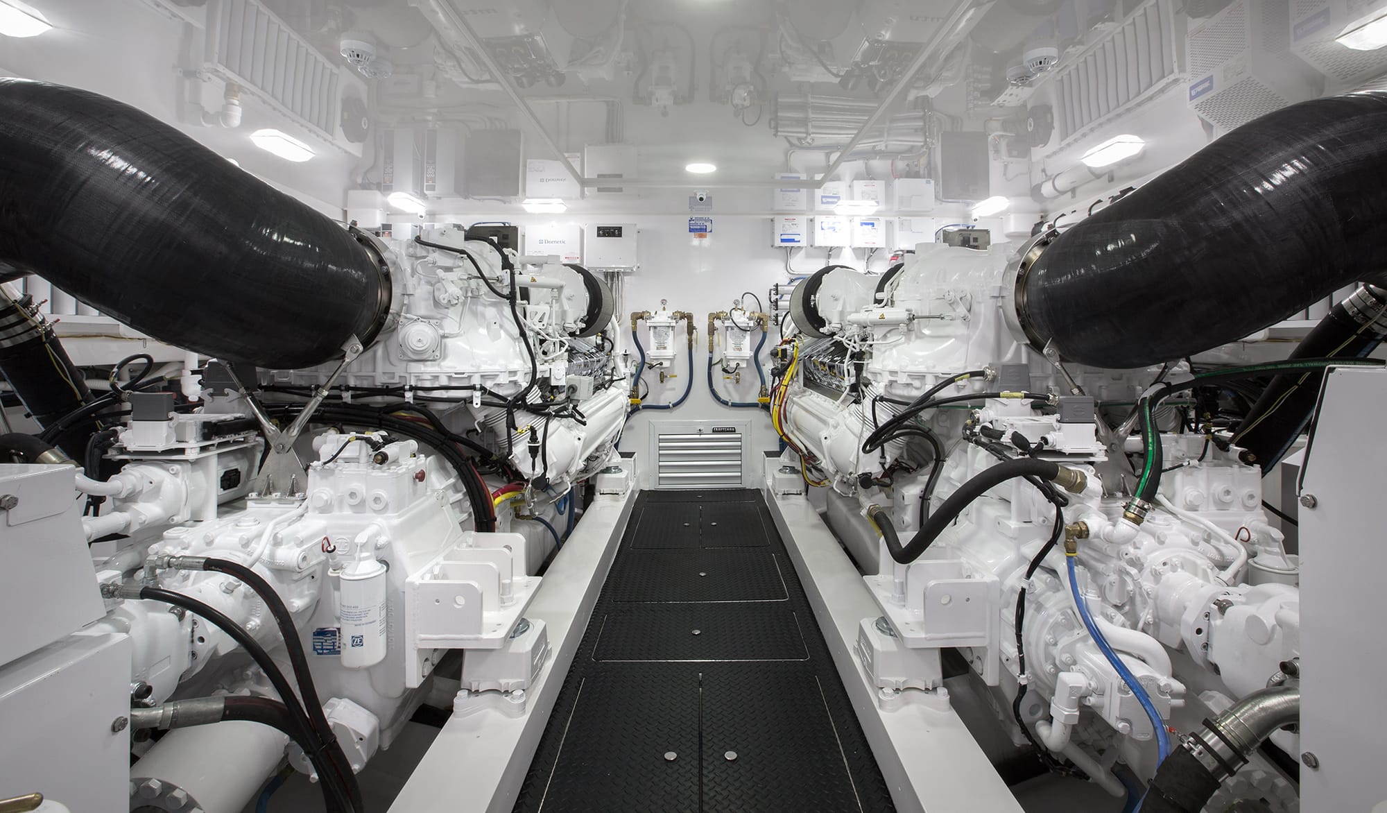 Every square foot is efficiently utilized, with four staterooms, a wealth of cleverly-concealed storage space, a well-equipped galley, and a stacked Bosch washer/dryer that make the 68C feel like a cruiser you could happily take anywhere. The engine room is cleanly-designed and well-lit, too,