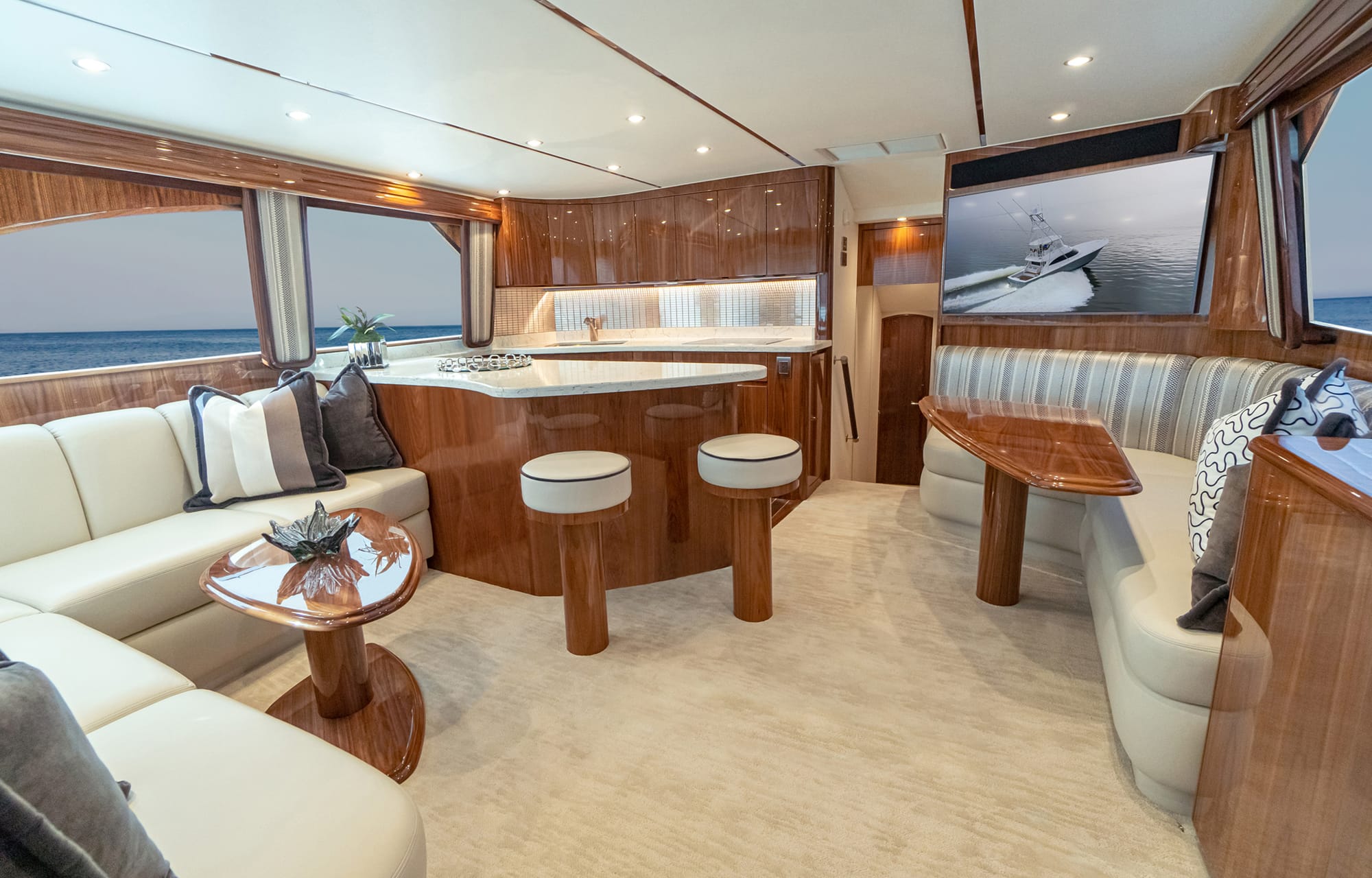 With five staterooms, including a full-beam master suite, and a spacious salon and galley, the Viking 90 blends comfort with purpose-built practicality. On deck, the enormous cockpit offers everything a tournament angler could want — from a mezzanine with integrated refrigeration to dedicated tackle storage and Viking’s signature centerline fighting chair. Powered by twin MTU engines, the Viking 90 delivers exceptional speed, range, and handling, whether pursuing billfish offshore or cruising in style.