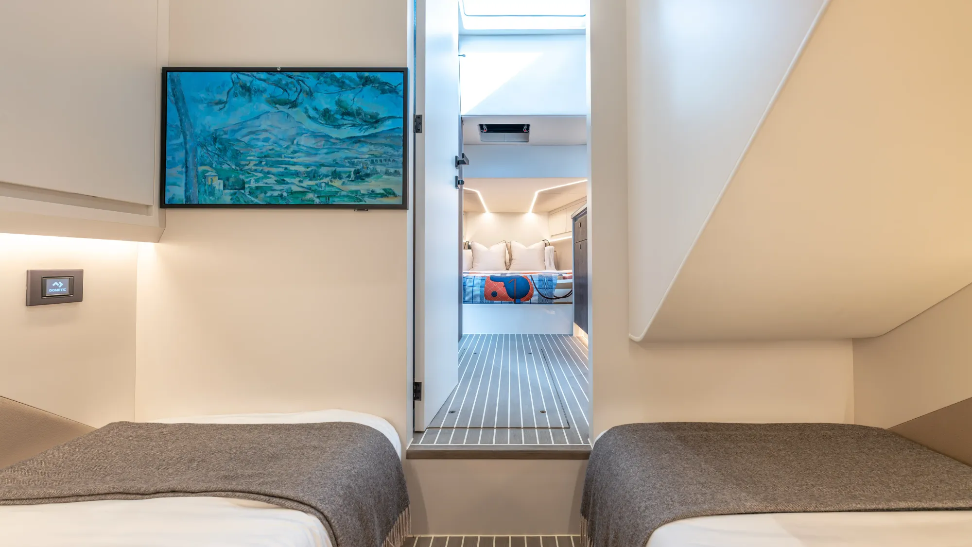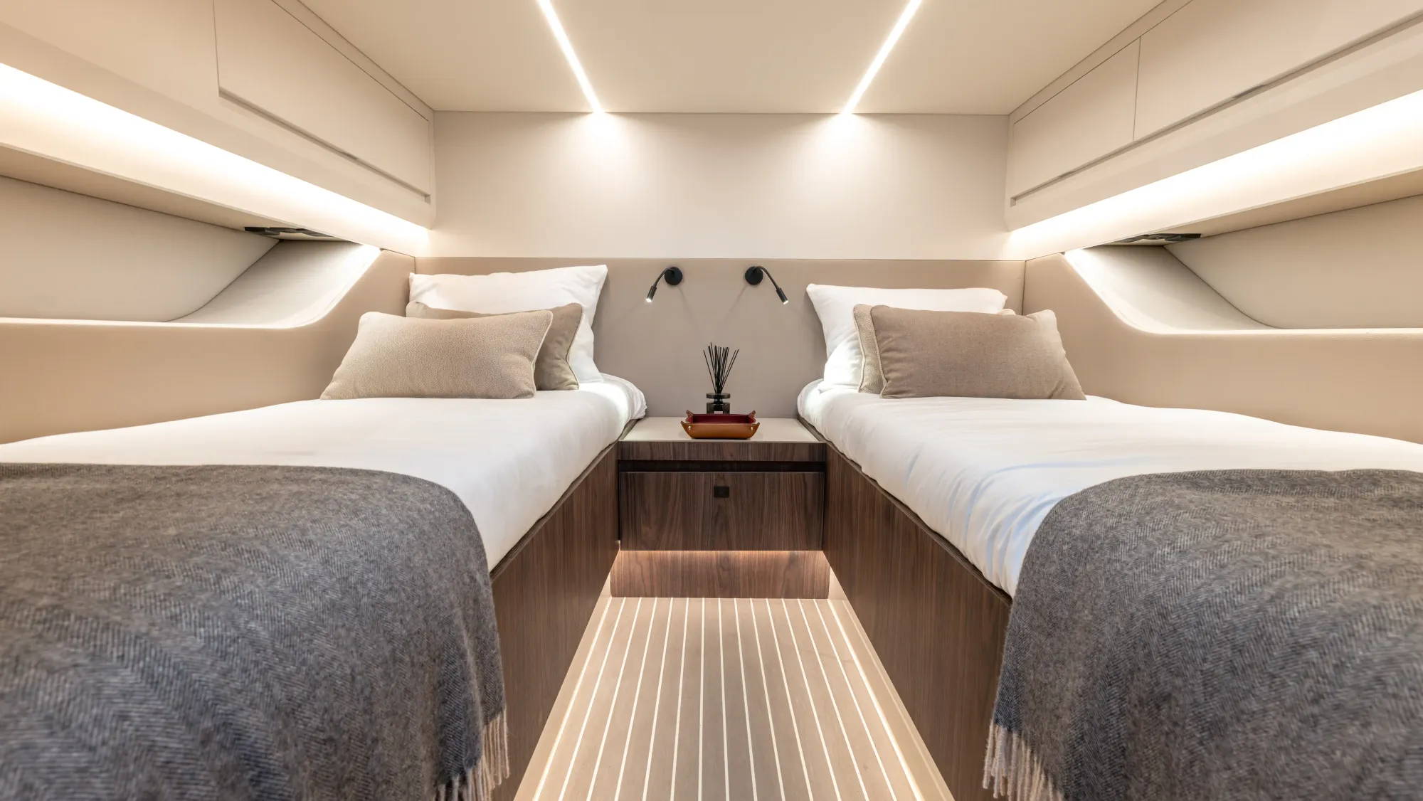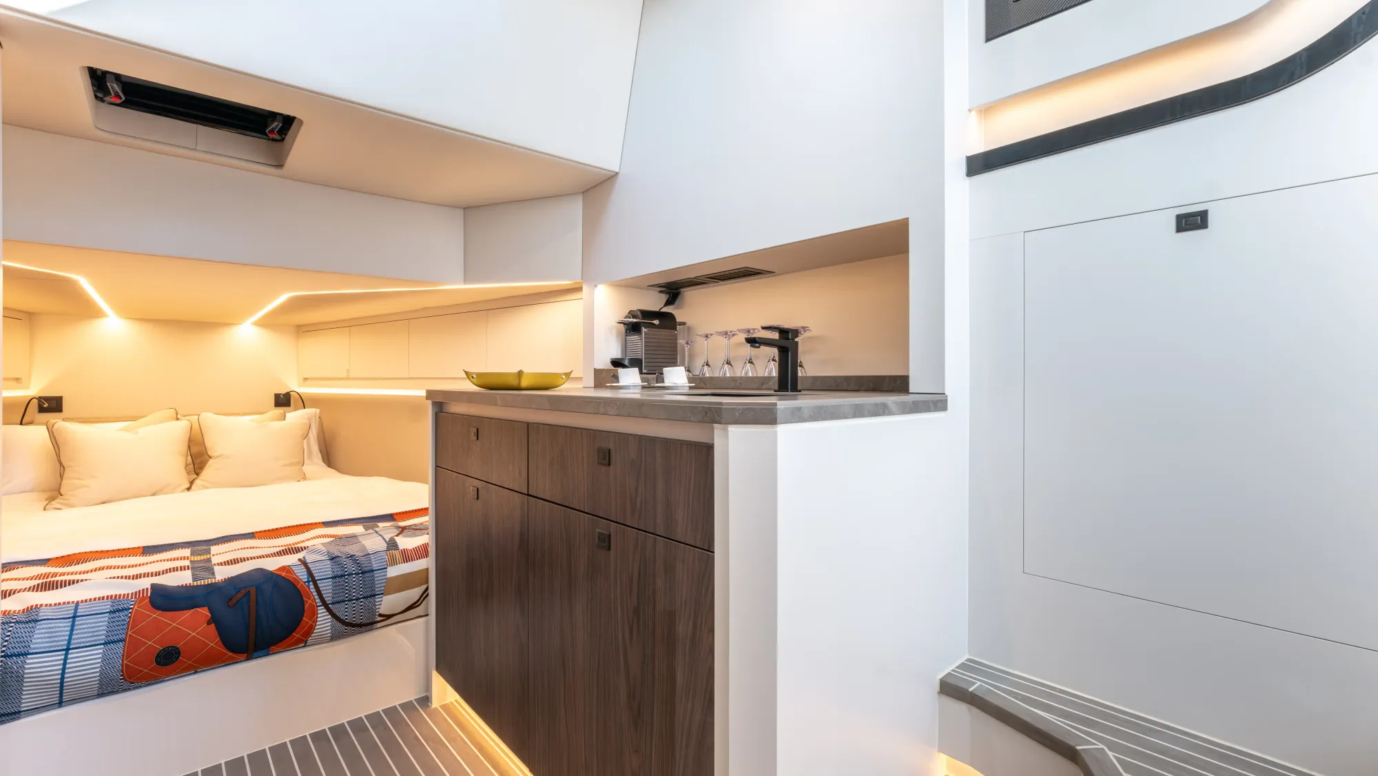 Below deck, the VQ55 continues to impress with two elegantly appointed cabins and a spacious dry head. The interiors boast leather-like wall finishes and stone-imitating counters, complete with a sink. Additionally, a Vitrifrigo wine cooler is provided, seamlessly blending with the yacht’s luxurious amenities. Furthermore, the cabinets are smartly designed with pre-cut holes, securing glassware even during high-speed travel. Importantly, an 8″ Garmin display is also included, enabling guests to easily monitor the yacht’s systems from the comfort of the lower deck.
